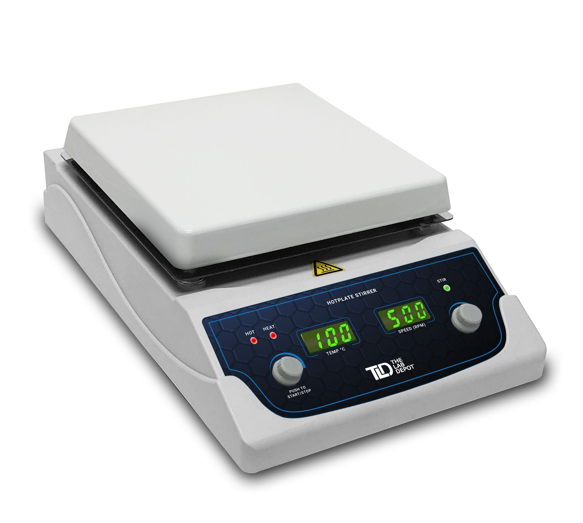 The Lab Depot Digital Hot Plate Stirrers provide reliable performance and safe operation for everyday laboratory use. Our space-efficient series features a durable, chemical-resistant white ceramic top plate and advanced microprocessor controls. The constant monitoring system provides precise temperature control with rapid heating and faster boiling times. In addition, the powerful motor drive system ensures efficient mixing in larger and more viscous samples.