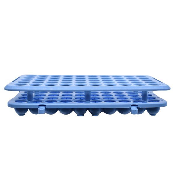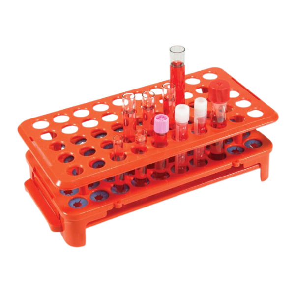 The Lab Depot Low Profile Grip Tube Racks securely hold fifty test tubes up to 17 mm in diameter. The rack has a five-by-ten configuration and comes in either blue or orange. Their low profile design ensures easy sample identification, and the rubber grips prevent tubes from slipping while decanting liquids.