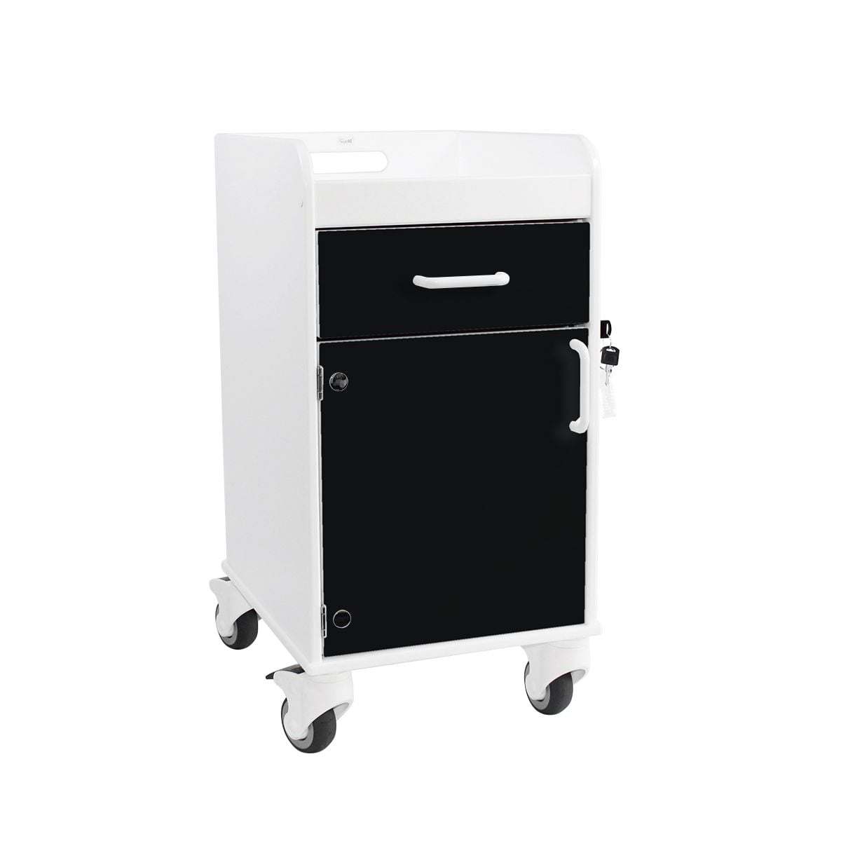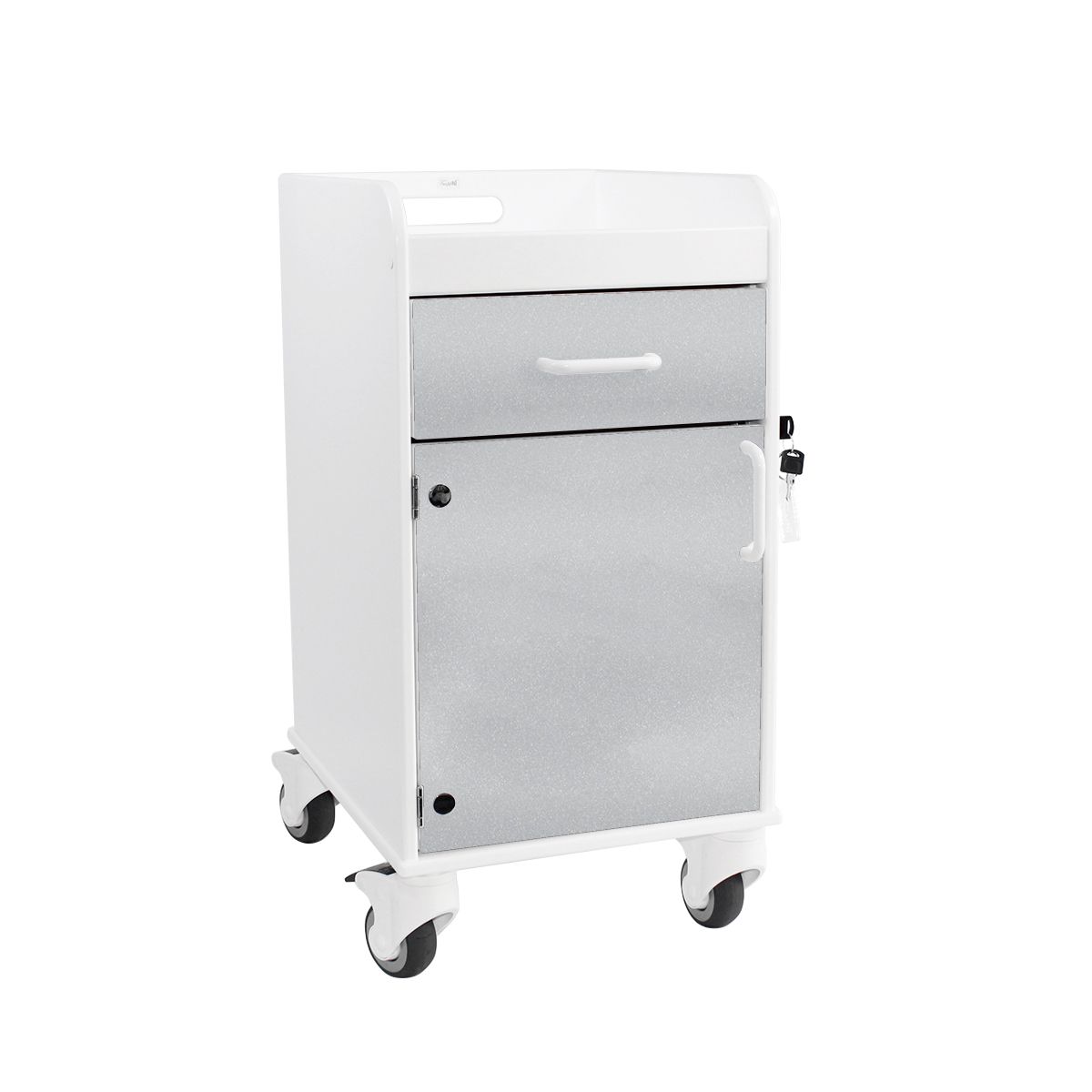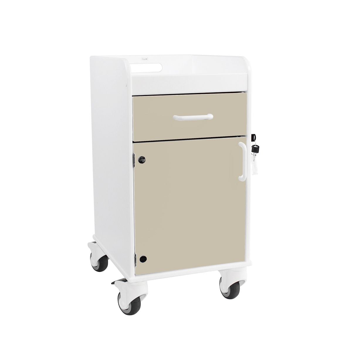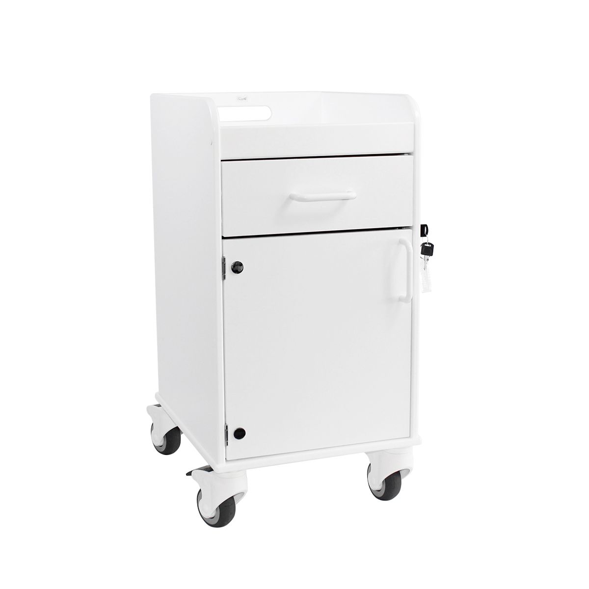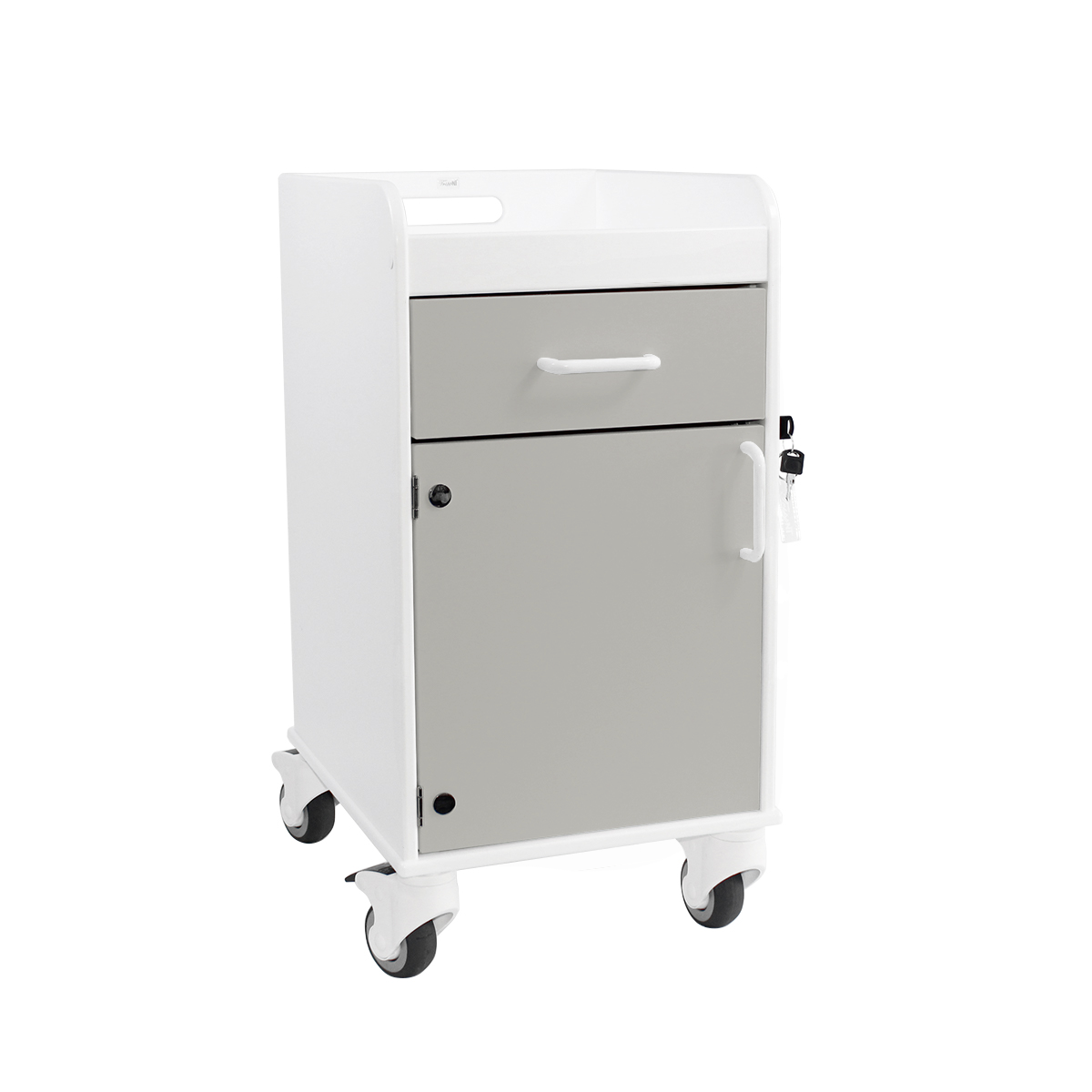 The Bedside Cart offers a secure, mobile, and easy-to-clean solution for storing and protecting patients' personal belongings in clinical or long-term care environments. Designed for both transit and stationary use, this cart features a built-in recessed tray on top. Ideal for holding frequently accessed items like phones, beverages, and personal effects without risk of slipping or falling.
