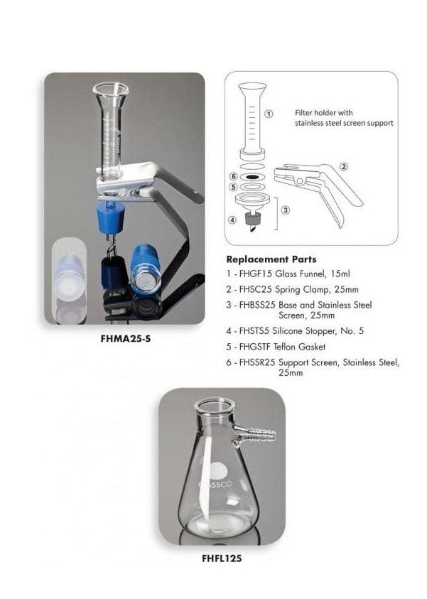 This all-glass filter holder is used in particulate contamination analysis for filtering aqueous, organic, or corrosive liquids. It is also recommended for HPLC solvent filtration. and PTFE coated stainless steel screen.